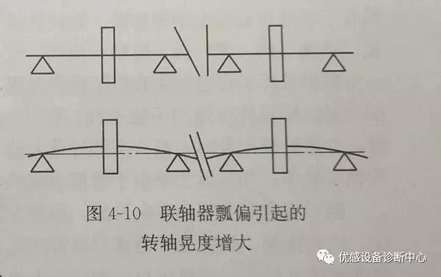如圖4-10所示,當(dāng)聯(lián)軸器端面與軸中心線不垂直時,螺絲擰緊后,轉(zhuǎn)子將產(chǎn)生變形,軸頸處出現(xiàn)較大晃度。距離聯(lián)軸器越遠(yuǎn),轉(zhuǎn)子晃度越大。轉(zhuǎn)子撓曲變形不僅會產(chǎn)生較大的激振力,還會破壞動靜間隙,導(dǎo)致軸承烏金或者汽封等處產(chǎn)生摩擦。