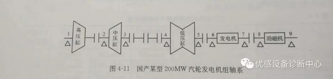 早期的國產(chǎn)200MW汽輪發(fā)電機(jī)組,如圖4-11所示,中壓和低壓轉(zhuǎn)子之間有一段跨距為4m、壁厚為0.04m的空心軸,又稱接長軸。該軸段剛性較差,在運(yùn)行中晃動很大,容易引起3號、4號軸承振動超標(biāo),已經(jīng)成為這類機(jī)組的通病。該型機(jī)組在運(yùn)行中應(yīng)嚴(yán)格防止接長軸承受沖擊扭矩如甩負(fù)荷、非同期并網(wǎng)等,檢修中應(yīng)盡可能減小接長軸與轉(zhuǎn)子對輪組裝后的晃動和瓢偏值。